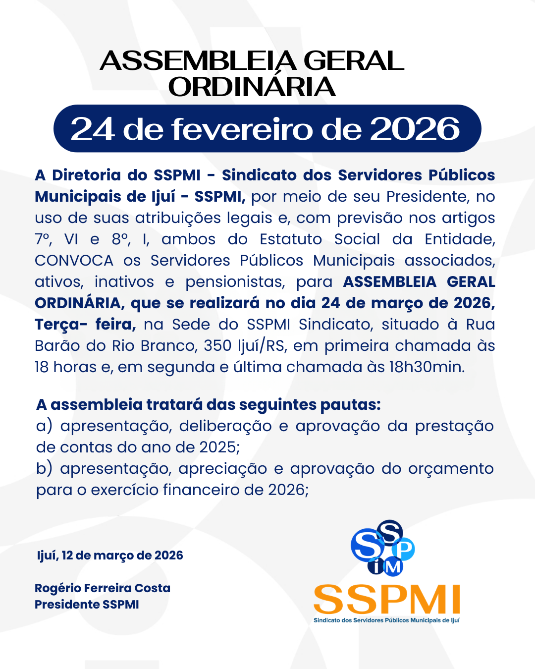 A SSPMI divulgou a convocação para a realização da Assembleia Geral Ordinária, que acontecerá no próximo dia 24 de março de 2026, reunindo servidores públicos