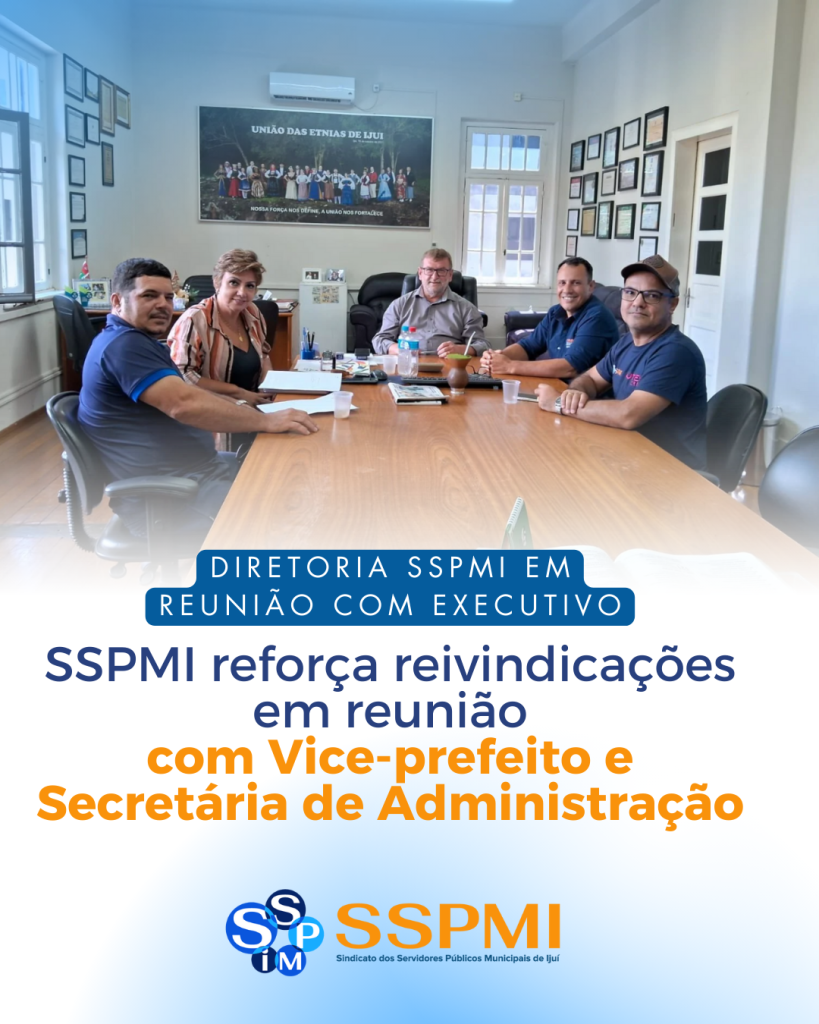 SSPMI reforça reivindicações em reunião com Vice-prefeito e Secretária de Administração Janeiro 12, 2026 Sem comentários SSPMI reforça reivindicações em reunião com Vice-prefeito e Secretária de AdministraçãoNa tarde desta segunda-feira, 12 de janeiro, o Presidente, o Primeiro Vice-presidente e o Tesoureiro-Geral Read More »